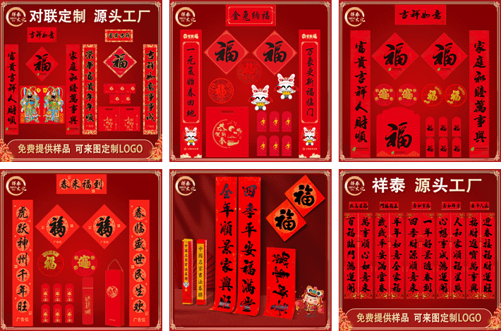 專業(yè)定制廣告對聯春聯、福字、窗花、紅包、禮包/禮盒。定制產品:植絨對聯、植絨福字、燙金對聯、彩印對聯、剪紙、利是封、紅包、彩印禮包、無紡布禮袋